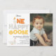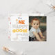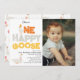 A beautiful hand drawn goose custom photo birthday invitation design. A cute "One happy goose" goose themed first birthday party invitation. A cute goose themed birthday invitation that can be customized to your details.