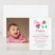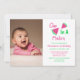 One in a melon first birthday invitation with pink and green colour script. Photo template via Pixabay licensed under CC0 and must be replaced with your own photo