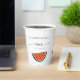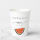 One In A Melon! Watermelon Birthday Theme, first birthday party paper cup set. Features, cartoon illustrated watermelon and coordinating pattern backing. Pretty "one" script graphic and template line for name.