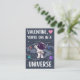 This cool Valentine's Day card features an astronaut in space with the words, "Valentine, you're one in a universe". Stars, the Earth, and three other planets are in the background, and a pink heart floats in the upper right hand corner. This card is great for kids who need to bring Valentines into the classroom. The back includes customisable text where you can add your child's name. Check out the collection for four more space-themed classroom cards.