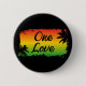 ONE LOVE button badge with black silhouette palm trees over a rasta flag coloured sunset