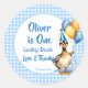 One lucky duck blue gingham 1st birthday party thank you favour stickers template , cute mallard duck with a party hat and balloons with soft pastel blue gingham border for boys 1st birthday party personalised favour stickers