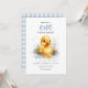 "One lucky duck" first birthday invitation with a cute duckling and a cottagecore gingham pattern background.