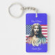 Carry your faith and patriotism wherever you go with this beautifully crafted "One Nation Under God" key chain. Featuring a striking image of Jesus Christ at the heart of the American flag, this key chain is a meaningful reminder of divine love and devotion to both faith and nation. The prayer on the back is a heartfelt expression of trust and guidance: