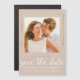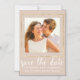 Elegant and chic gold, blush and ivory colour palette. Your photo is surrounded by a gold frame with a modern ivory white dot pattern on its interior. Save the date is written in a beautiful script font. Your names, wedding date and location follow.