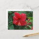 Photograph of single open delicate red hibiscus flower, buds, and green leaves on a Caribbean rain forest path. Daydream about a tropical paradise!