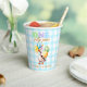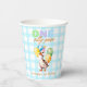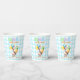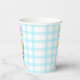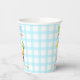 Cute one silly goose 1st birthday theme, boy birthday party paper cups featuring a cute watercolor baby goose with a party hat and balloons on a soft blue gingham plaid background.