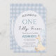 This adorable "One Silly Goose" themed birthday invitation features a charming watercolor goose wearing a party hat, playful fonts, and soft pastel blue tones perfect for a baby boy’s first birthday.
