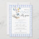 This charming first birthday party invitation features a cute little goose holding balloons and a blue gingham background. Designed by Thisisnotme©