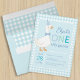 The background is light blue and white gingham chequered plaid pattern. The text is inside a light blue rectangle with round corners and white border. On the left, there is a cute white goose with a blue party had and a blue bow tie. The text is on its right. The word ONE has each letter in a different shade. The name is written in a blue script.