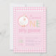 The background is pink and white gingham chequered plaid pattern. The text is inside a pink rectangle with round corners and white border. The word ONE has each letter in a different colour, and a white goose with a blue party hat inside the big O. The name is written in a pink script. In the lower part, i there is the info, with the date / time as a the left column, with the day big; they are separated by white lines.