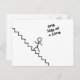 Hand drawn black stick man running up a flight of stairs with "one step at a time" slogan postcard.