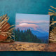 The setting sun casts colours across the land, and highlights the clouds surrounding Mount Rainier.
