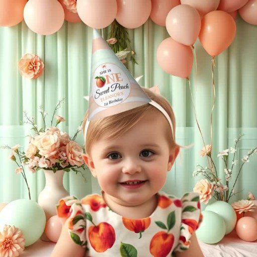 One sweet peach First Birthday watercolor stripes party hat. This First Birthday design features the text "ONE sweet peach" which cleverly incorporates a peach graphic in place of the letter "O". The text is placed in a white round frame all placed on a patern of watercolor stripes in peach and mint green.