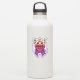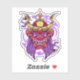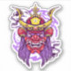 This vibrant illustration features a fierce Japanese oni mask, a traditional demon or ogre figure. The mask is predominantly red, with sharp teeth and glowing eyes. A golden helmet adorned with horns sits atop the mask, and long, flowing purple hair frames the face. On either side of the mask, two skulls are positioned, adding to the menacing atmosphere. The background is a swirling mix of black, white, and purple, creating a dynamic and energetic composition.