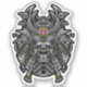 This image depicts a stylised samurai mask, inspired by the oni, a Japanese demon or ogre. The mask is primarily metallic, with intricate details and a menacing expression. The eyes are narrowed, and the mouth is open in a ferocious snarl. A cherry blossom is prominently displayed on the forehead, adding a touch of contrast and symbolism. The mask is framed within a circular design, further emphasizing its powerful presence.