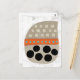 A fun, whimsical and totally cute abstract graphic in neutral colours with pops of orange and turquoise along with big black circles. The main images is a beige shape with lighter squares in 3 rows, then an orange band with aqua dots, large circles below. All on a textured white background.
