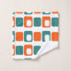 This towel set has a mid-century modern design of repeating orange rectangles with white rectangles inside alternating with teal rectangles.