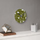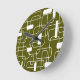 This clock has a mid-century modern design of open and closed rectangles in white on a field of camo green.