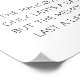 My thoughts on this product was excellent. Well printed in a gloss finishing and just the size l ordered. It arrived in good condition and am overall satisfied with the product. The printing turned out great. I was quite surprised with the finishing touch to the poster. The semi gloss was just right and a perfect size to display at the wedding.