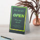 Open sign in trendy green black colours. Opening hours and texts can be customised or deleted.