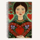 An open-hearted woman in a cheerful folk art style with hearts and flowers beams compassionately out from this journal or notebook.