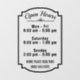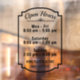 Display your business' hours of operation with this personalised vertical window cling. The design includes a modern frame shape and a flourish below the words "Open Hours," plus room for you to include the days and times of operation and more text, such as your business name and phone number. Use the easy template to personalise. DESIGN TIP: You can also "customise further" to rearrange, resize or delete any element. All fonts and colours can be changed - including the colour of the flourish and frame!
