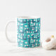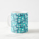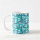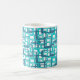 This mug has a mid-century modern design of open rectangles in blue over open rectangles in robin's egg blue.