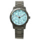 This women's watch has a mid-century modern design of open rectangles in blue over open rectangles in robin's egg blue.