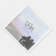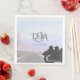 A motorcycle with two helmets sits against a dusky sunset background on this biker couple wedding reception napkin. It can be easily customised to suit your own needs.
