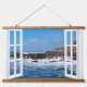Beautiful watercolor brush rendition of a stunning seaside view out the open window at your ocean getaway.
