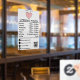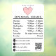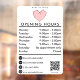 A white opening business hours window decal and window cling featuring a bobby pins heart logo, QR Code, your custom social media icons and contact details. A personalised shop hours window cling perfect for shop windows and front door signs. Perfect for a business shop owner who would like to notify their customers about its opening hours.