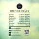 A black opening business hours window decal and window cling featuring business logo, QR Code, your custom social media icons and contact details. A personalised shop hours window cling perfect for shop windows and front door signs. Perfect for a business shop owner who would like to notify their customers about its opening hours.