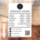 A white opening business hours window decal and window cling featuring business logo, QR Code, your custom social media icons and contact details. A personalised shop hours window cling perfect for shop windows and front door signs. Perfect for a business shop owner who would like to notify their customers about its opening hours.