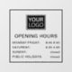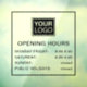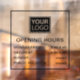 Opening hours window cling featuring black or custom colour text on a transparent background and a custom logo template.
