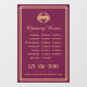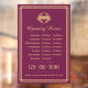 Display your business hours to clients and customers with this stylish window cling. A vintage-inspired design featuring classic typography and a simple art deco border. This professional template is personalised with your company logo, opening times, telephone number, and website. It offers fully customisable text to fit your business brand. You can also change the background colour by using the design editor tool. This adaptable design is ideal for a variety of establishments, stores, offices or services, including restaurants, cafes, salons, boutiques, dry cleaning services, and more! Printed colours: deep pink plum and gold colour. If you’d like your logo to coordinate with the gold type colour, the Hex colour code is #DEBE79
