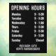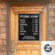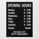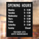 Opening Hours window display for a shop. Alter details as you wish. Displays up to 7 days and opening times. Black and white.