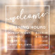 Square, opening hours window cling featuring the text "welcome" in an elegant calligraphy script font and your opening hours. White text on a transparent background.