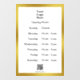 This business sign has a template you can edit to show your hours of operation. A display image, which you can replace with your business logo, is at the top. A QR code is near the bottom. (Remember to enter your website for the QR code to work correctly.) All text can be edited or deleted. The sign has an elegant faux (not foil) gold border.