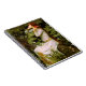 This notebook features a classic 1894 oil painting by John William Waterhouse, an English painter: Ophelia--a character in William Shakespeare's dramatic play, Hamlet. Ophelia is a young woman from Denmark who meets a tragic end. In this artwork, she has long auburn hair, and is seated poised atop a body of water on what appears to be a fallen tree trunk or branch.
