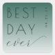 This wedding sticker features a minimalist design with a gradient background transitioning from dark teal to light green, creating a fresh and calming vibe. The phrase "BEST DAY ever" is prominently displayed in bold uppercase letters paired with elegant cursive script, adding a touch of whimsy and celebration. The modern layout emphasizes simplicity and clarity, making it perfect for commemorating special occasions like weddings. Its cool color palette and clean lines evoke an optimistic and joyful mood, ideal for capturing the essence of memorable life moments.