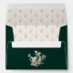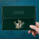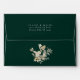Chic solid colour emerald green 5x7 envelope with return address in coordinating light beige colour on back flap. Gilded floral and foliage bouquet accent. Envelope is lined with a faux gold Art Deco pattern. Designed to match our Opulent Gilded Garden Collection.