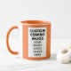 ORANGE 4:6 portrait aspect ratio double image frame custom Combo Mug for photo or logo, 11 oz., 3.2" diameter x 3.8" high, with ORANGE background double image frame (two individually customizable design areas) providing maximum coverage of the mug in ORANGE. See store for more templated font options. The background color has been chosen to closely resemble the combo mug inside and handle color but may not match exactly, due to the difference between printing and enamel tones.