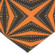 A vibrant bright orange and black abstract starburst patterned designed table runner featuring a diamond pattern within the radiating lines, along with spots radiating out from the center.