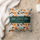 Orange flowers, blue and dark green foliage floral personalised throw pillow.