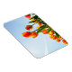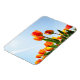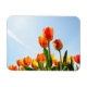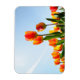 Rectangular photo magnet with flowers consisting of orange and red tulips seen from a low point of view against a blue sky.