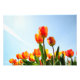 Photo print of flowers consisting of orange and red tulips seen from a low point of view against a blue sky.