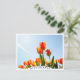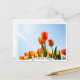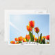 Postcard with flowers consisting of orange and red tulips seen from a low point of view against a blue sky with a white edge and in white the text 'Netherlands'.