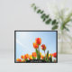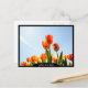 Postcard with flowers consisting of orange and red tulips seen from a low point of view against a blue sky with a black edge and in white the text 'Holland'.
