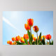 Poster print of flowers consisting of orange and red tulips seen from a low point of view against a blue sky.